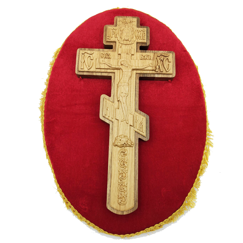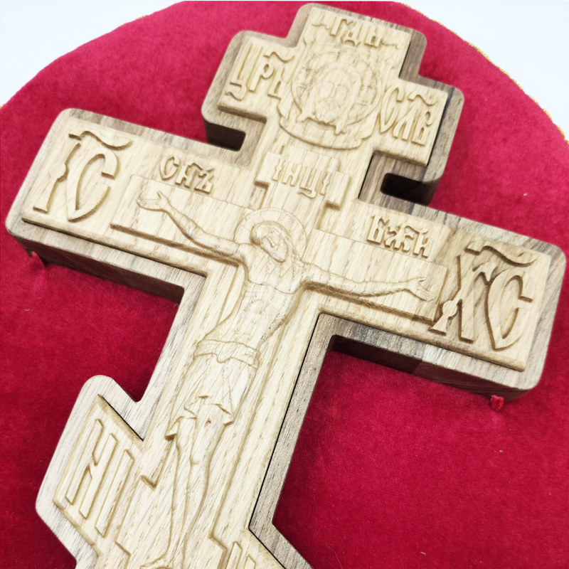 ● Різьблені хрести. Ці хрести можуть бути виконані з різних порід дерева, таких як дуб, кедр та ін. Різьблені візерунки можуть включати рослинні мотиви, зображення ангелів, святих або біблійних сцен. Також різьблений хрест може бути виконаний із металу. Вироби з металу можуть бути прикрашені складними різьбленнями або виступами, які додають їм величності та елегантності. Металеві хрести часто покриваються позолотою або іншими металевими оздобленнями для створення більш розкішного вигляду.