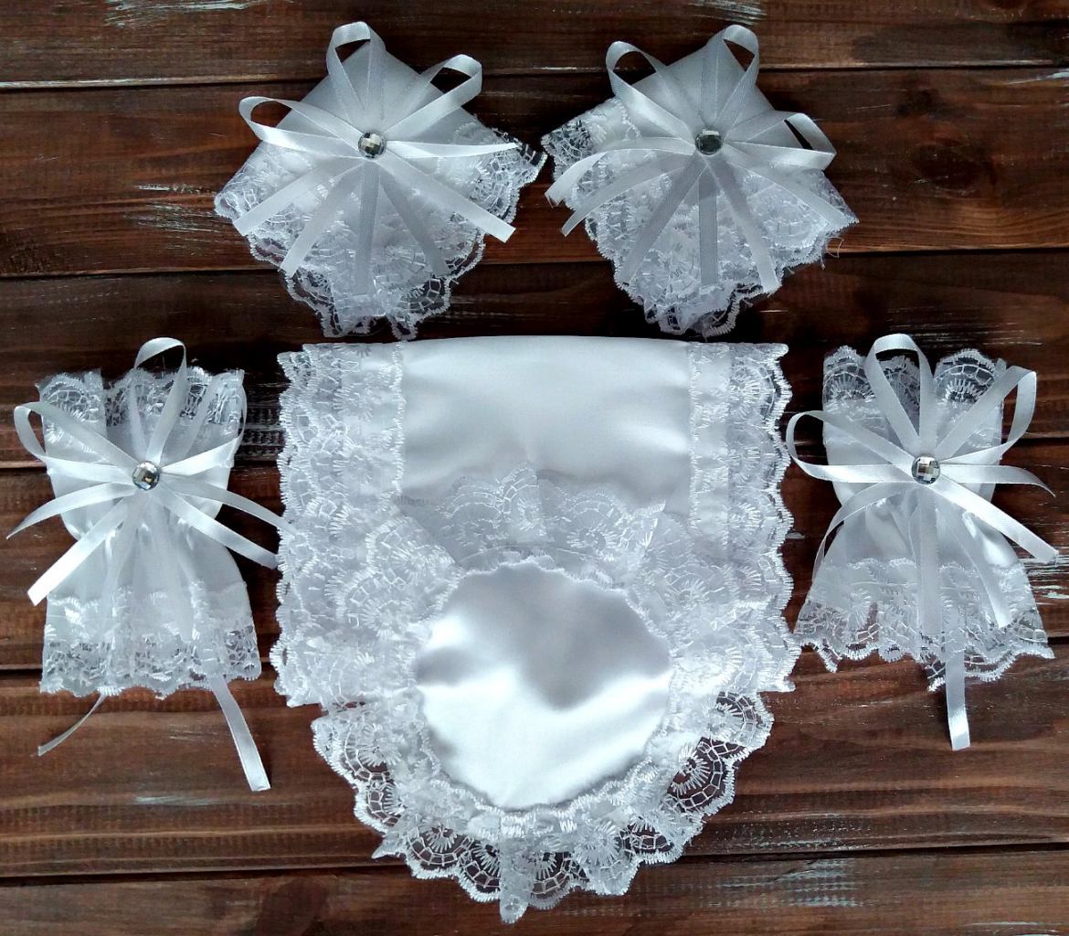 Артикул: 285534 Найменування: Вінчальний набір ХТ-ВН1 білий Опис: Набір пошитий з атласу та мережива. Декорований камінцями та бантиками. У комплект входить: рушник для перев'язування рук (112*19 см), кругла серветка для піднесення кілець (дмаметр 17 см), два платочка для утримання вінця (19*18 см) і дві серветки на зав'язках для свічків (23*11 см). Одиниці виміру: набір Залишок на складі: 3.000 Ціна: 360.00 грн.