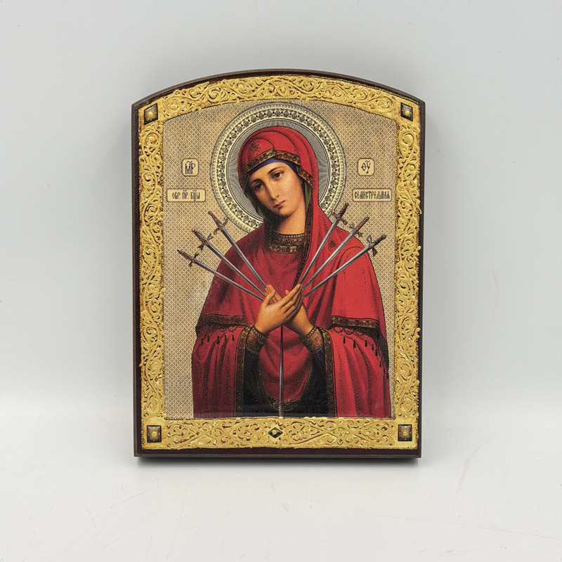 Примечательно то, что обычно Божия Матерь изображается вместе со своим Сыном или со святыми и ангелами. На этой иконе она изображена в одиночестве, пронзённая семью мечами. Они являются символом той печали и боли, которую испытывала Пресвятая Дева Мария на земле. Перед "Семистрельной" принято молиться о врагах, о смягчении сердца именно поэтому этот образ известен ещё как икона "Умягчение злых сердец". Перед ней также возносят молитвы об успокоении враждующих, о ниспослании им терпения, об излечении от хромоты и холеры. В годы войны перед "Семистрельной" читают молитвы о том, чтобы оружие не коснулось воинов и защитников Родины.