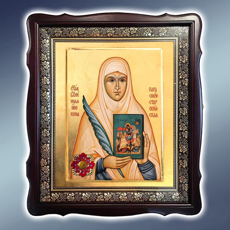 Ікона віддрукована високоякісними сольвентними фарбами у фігурному відкривному дерев'яному кіоті з багетним окладом, на іконі вмонтована ажурна металева капсула, у якій на воску закріплена частинка мощів святої блаженної Параскеви Старобільської