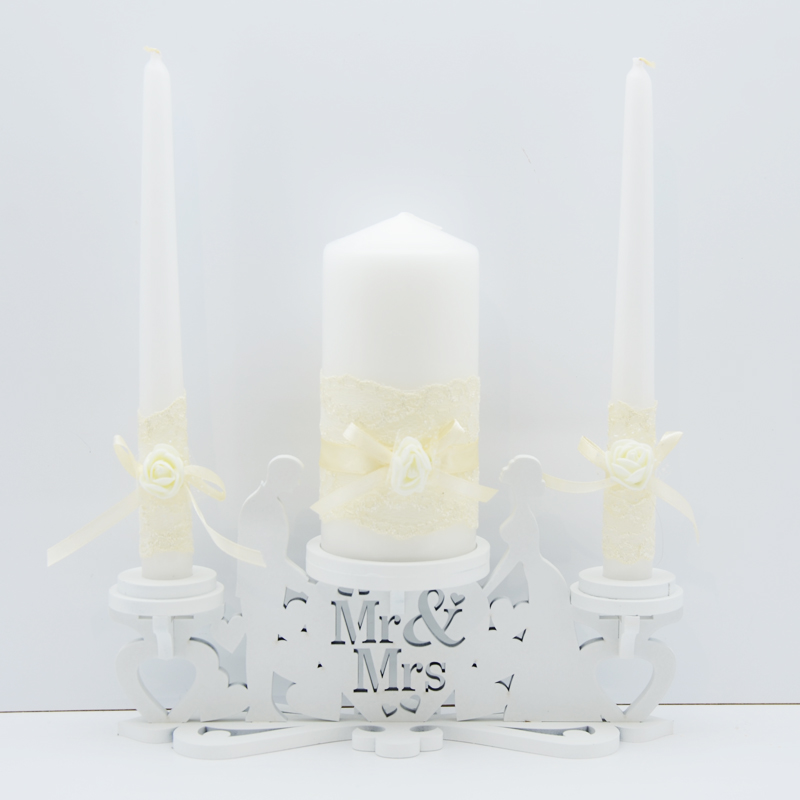 Весільні свічки для обряду "Сімейне вогнище". Декоровані атласними стрічками, мереживом та штучними квітами. Ручна робота. Підставка в комплект не входить.